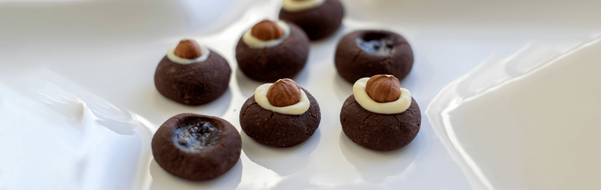 Aus dem Teig formen wir kleine Kugeln, die wir auf ein mit Backpapier ausgelegtes Backblech legen. In die Mitte jeder Kugel drücken wir mit dem umgekehrten Ende eines Kochlöffels eine Vertiefung. Das Backblech schieben wir in den auf 170 °C vorgeheizten Backofen und backen die Plätzchen etwa 10 Minuten lang. Die