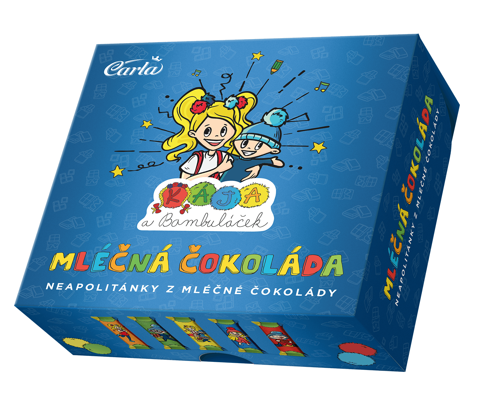 Mléčné čokoládky, které potěší nejen mlsné jazýčky. Každá čokoládička má na obalu jeden z pěti veselých obrázků Káji a Bambuláčka. Děti je určitě ocení jako malé mlsaní ke svačince do školy.