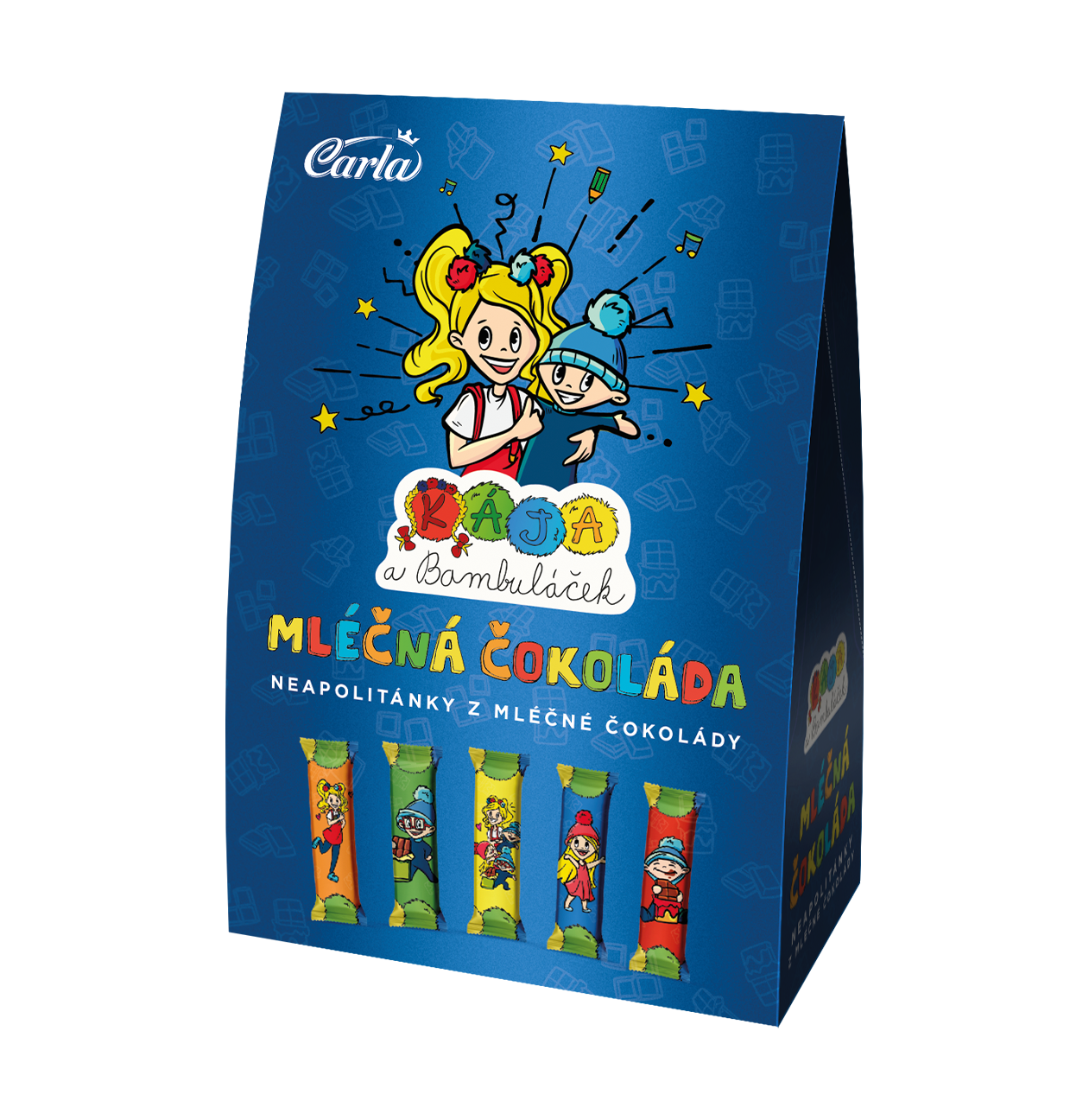 Mléčné čokoládky, které potěší nejen mlsné jazýčky. Každá čokoládička má na obalu jeden z pěti veselých obrázků Káji a Bambuláčka. Děti je určitě ocení jako malé mlsaní ke svačince do školy.